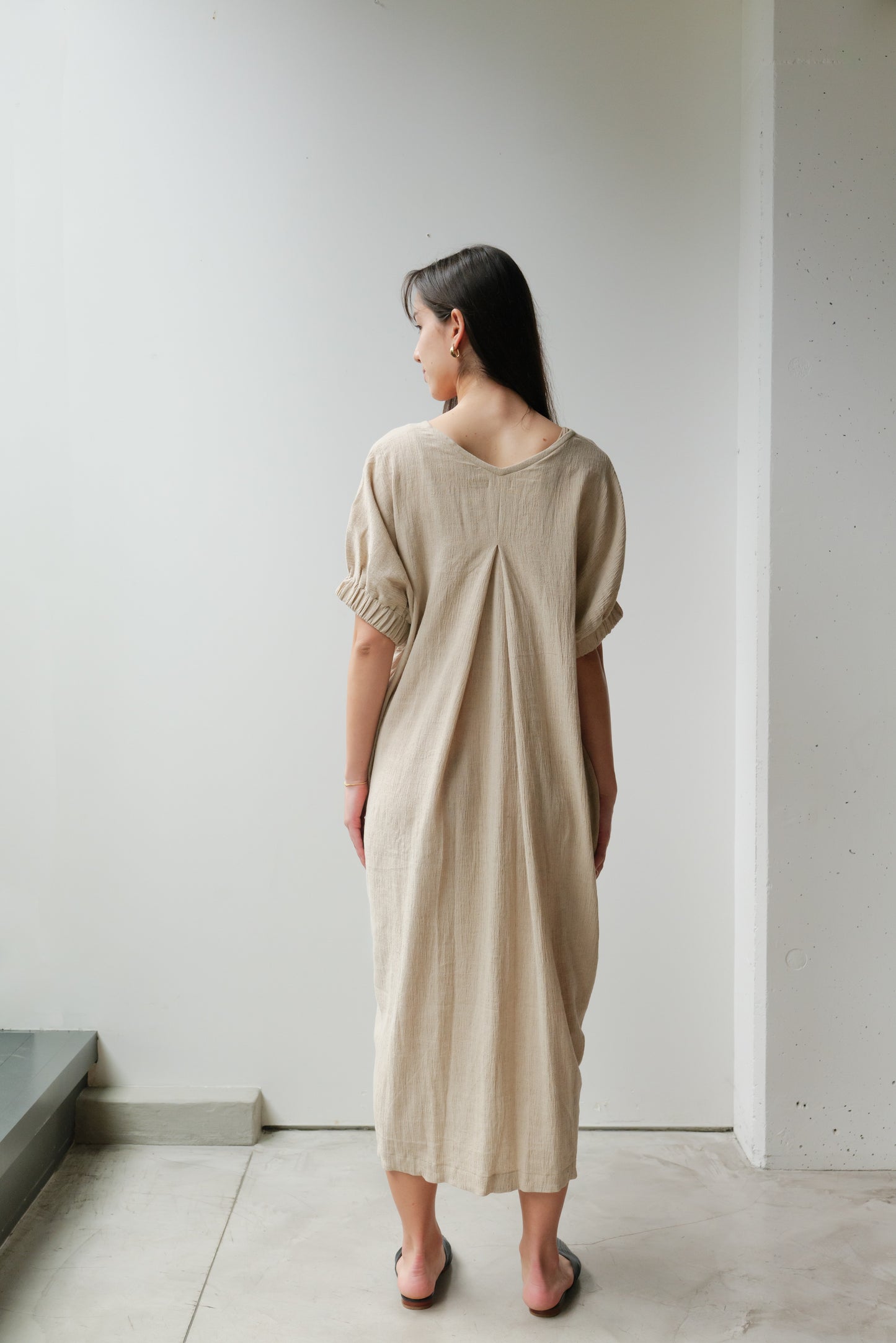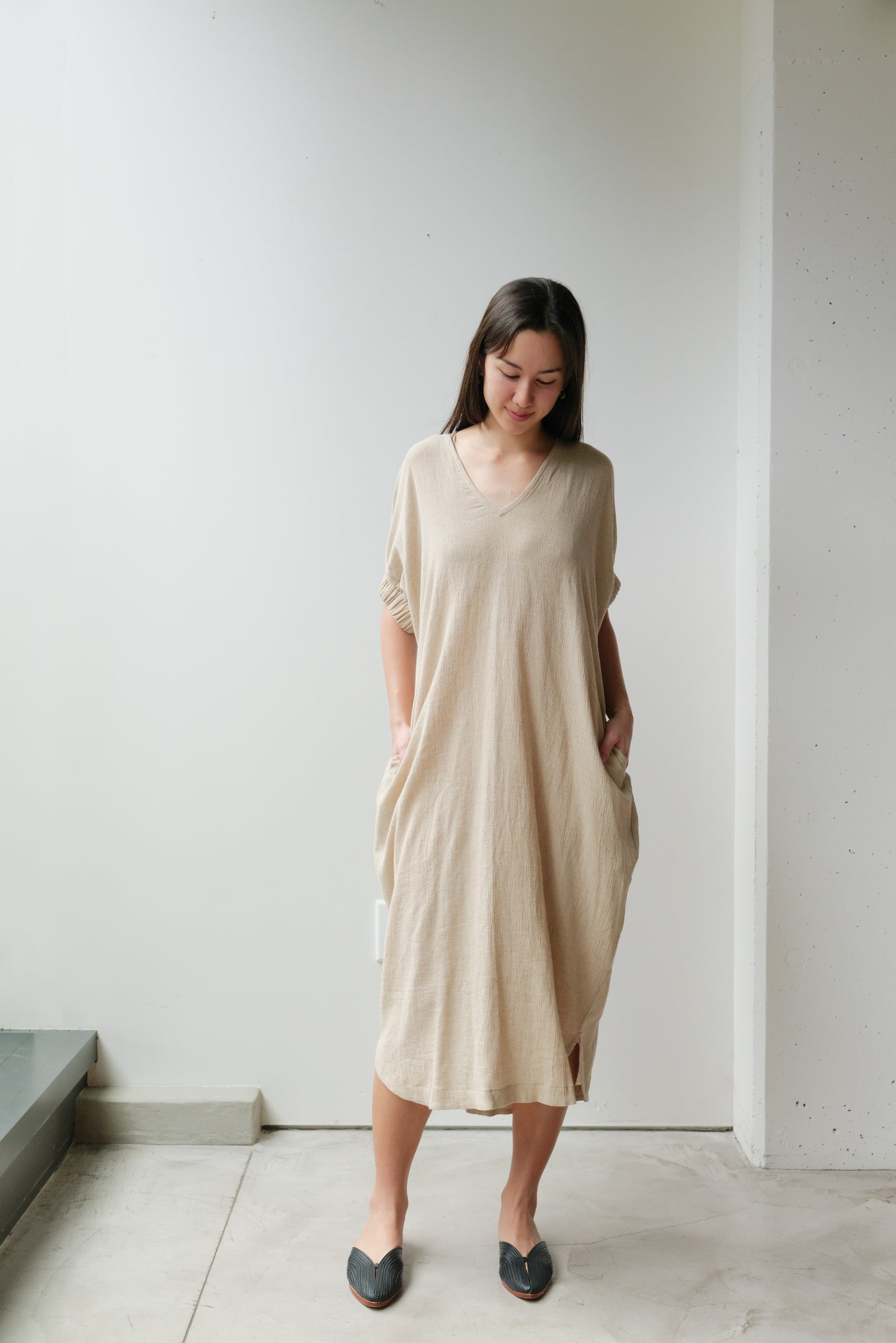 V-neck dress with elastic cuffed sleeves and hidden side pockets. Relax fit.
