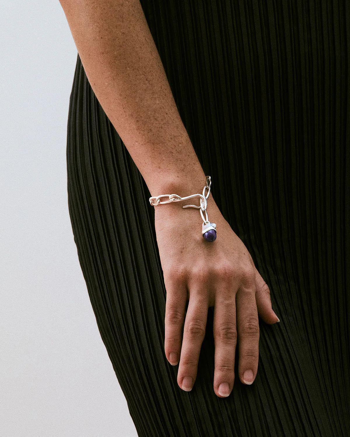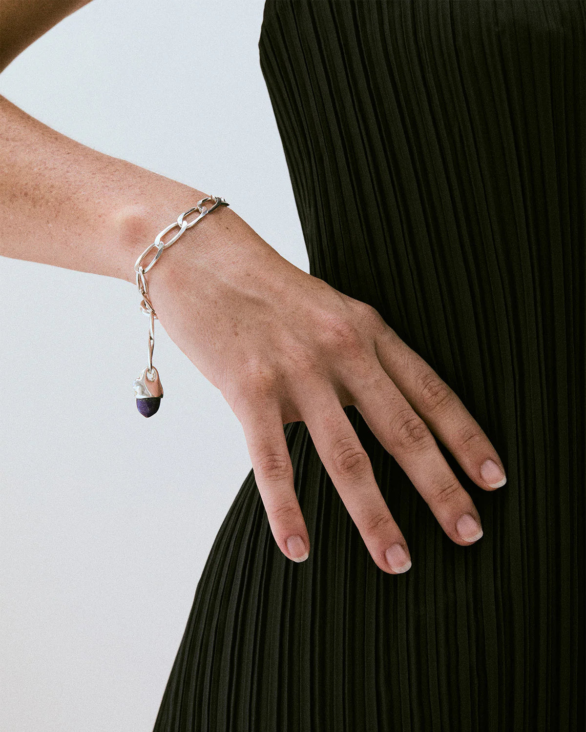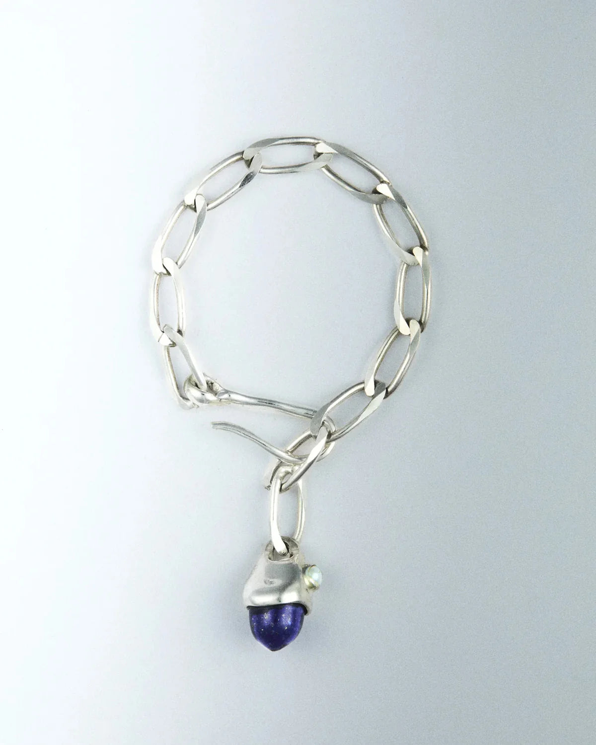 A simple sterling silver link bracelet with a drop pendant featuring our classic pairing of lapis lazuli and freshwater pearl. Finished with an adjustable hook closure that fits into any link for a customizable fit.