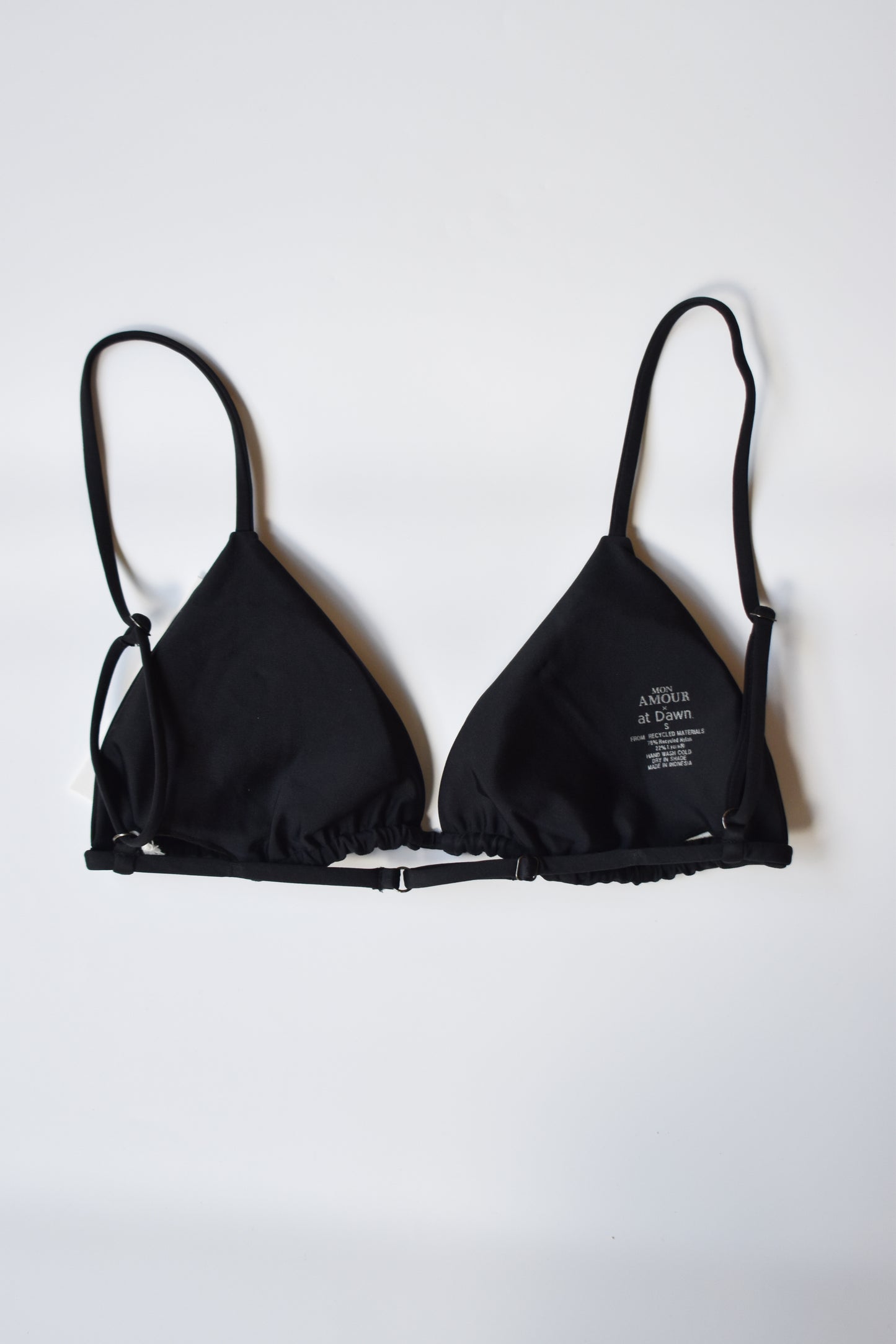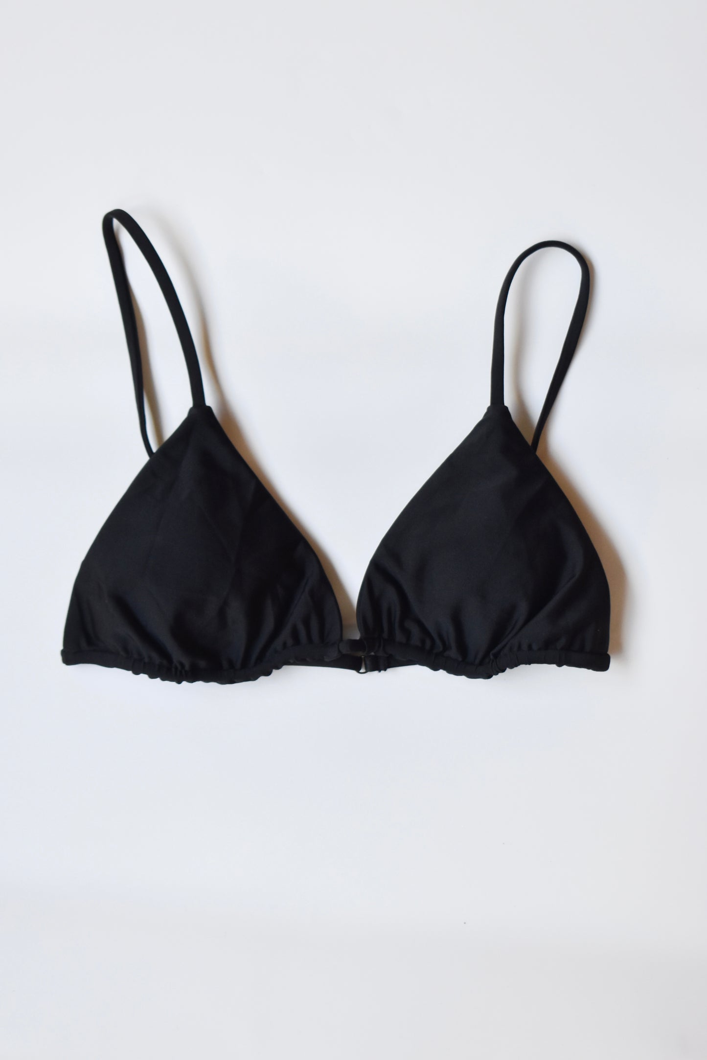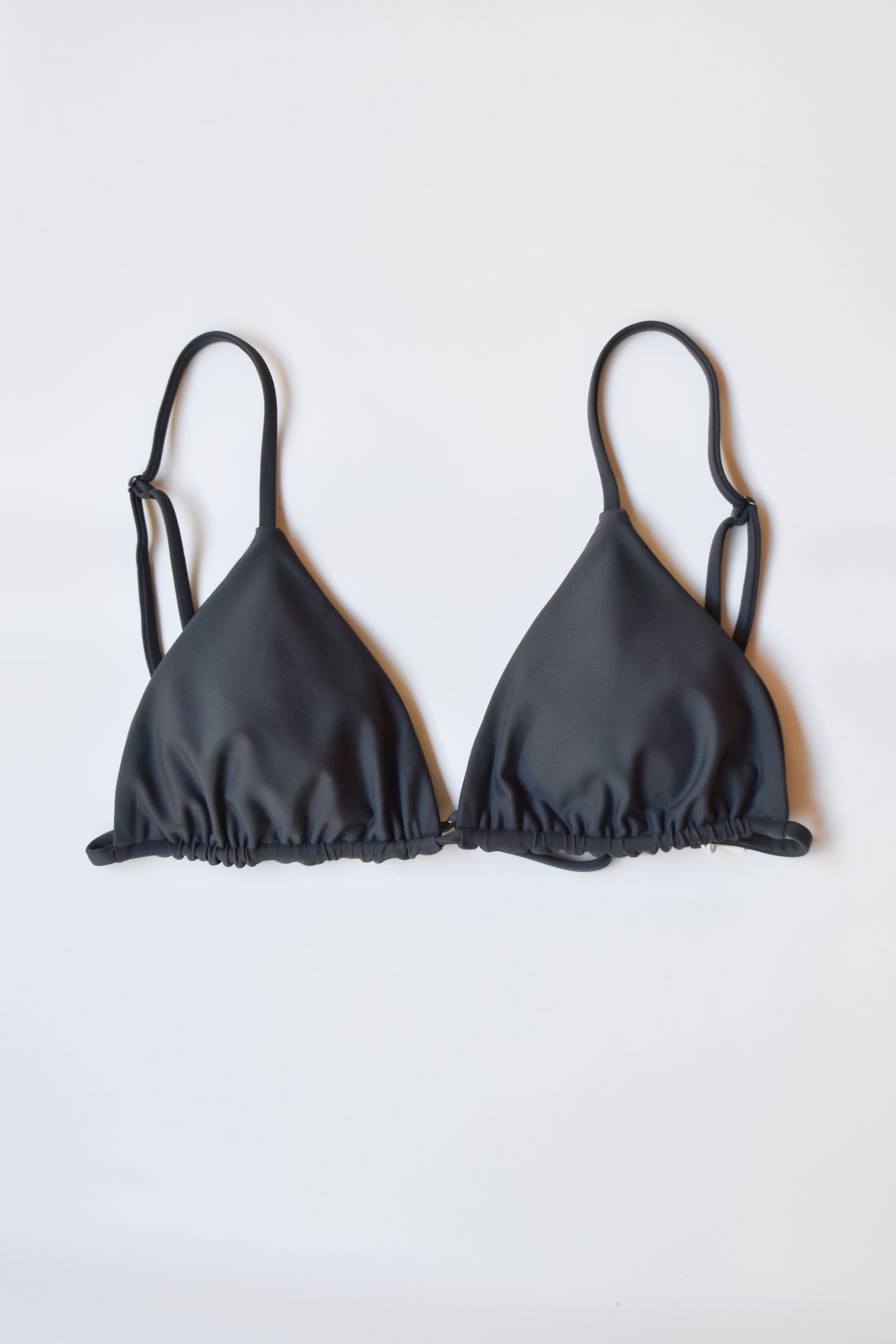 Triangle bikini top with adjustable shoulder straps, adjustable underband, and removable padding.