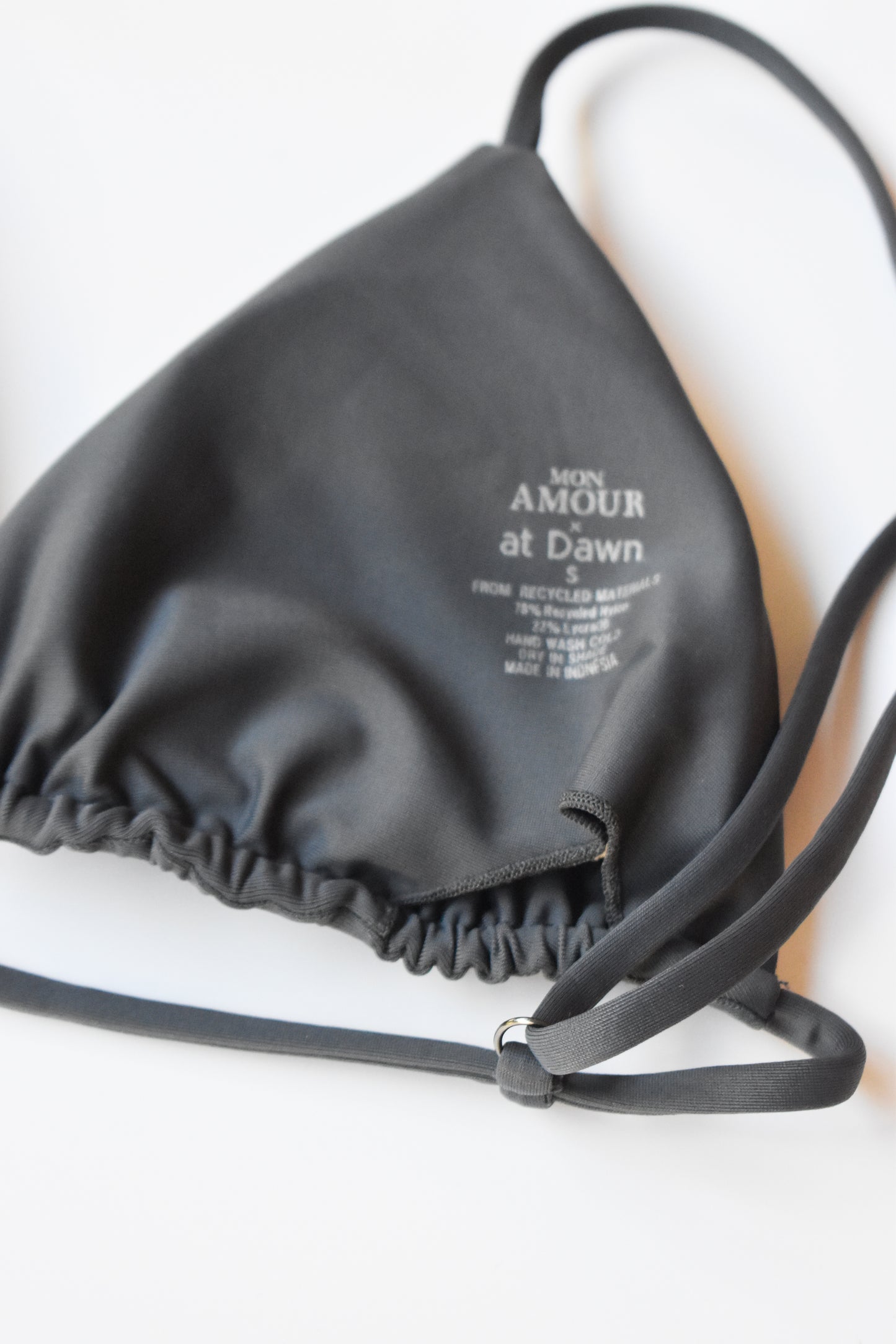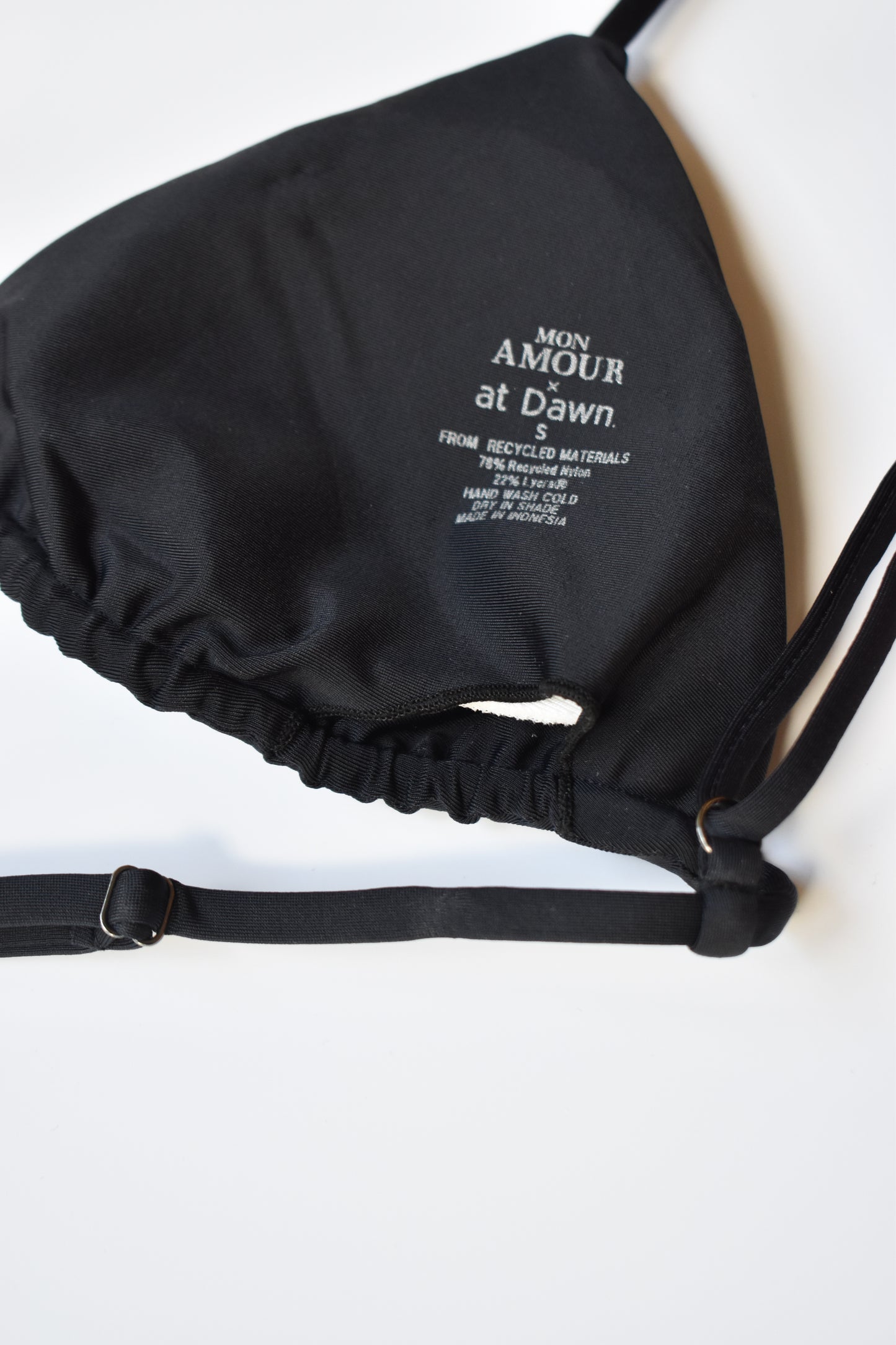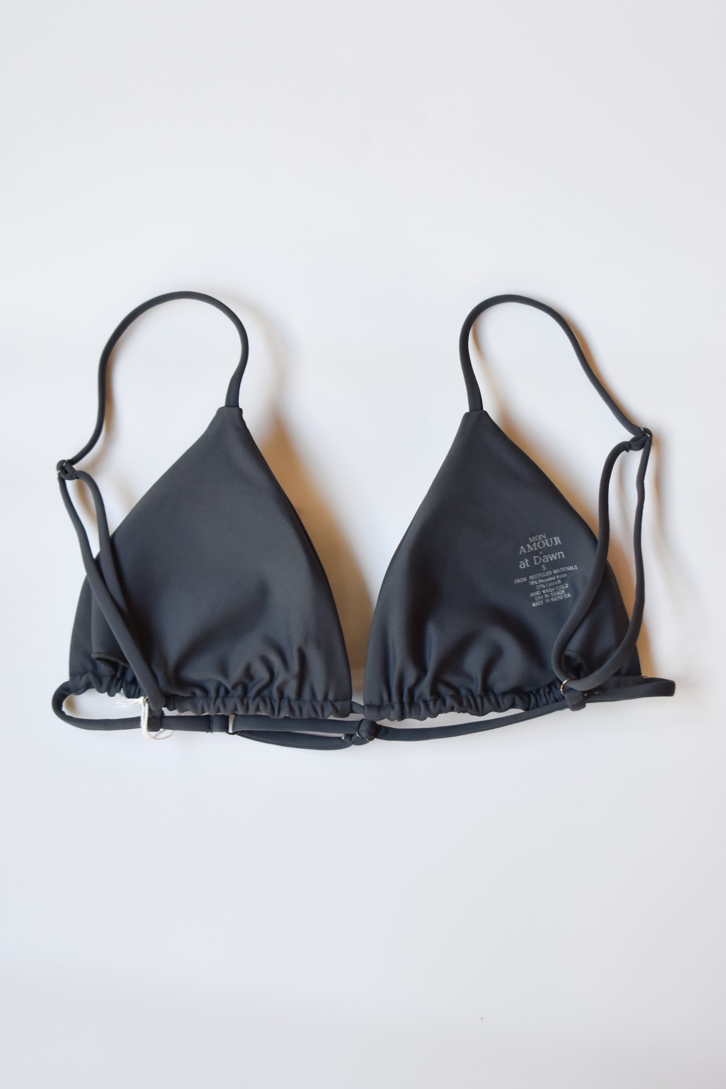 Triangle bikini top with adjustable shoulder straps, adjustable underband, and removable padding.